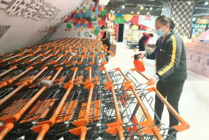 門(mén)店內嚴格執行消毒工作,消毒購物車(chē)、貨架等重點(diǎn)關(guān)注區域,同時(shí)對電梯按鈕、扶梯、衛生間等角落進(jìn)行定時(shí)消毒。在超市入口、收銀區等設置一米線(xiàn),掃碼、量體溫、戴口罩,嚴格執行進(jìn)門(mén)三部曲,并時(shí)刻提醒消費者保持距離,做好疫情防控相關(guān)措施。