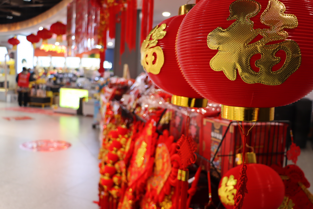 年味裝飾那是不用說(shuō)的了,各種型號吉祥如意燈籠串、福字,掛哪都有那個(gè)味~